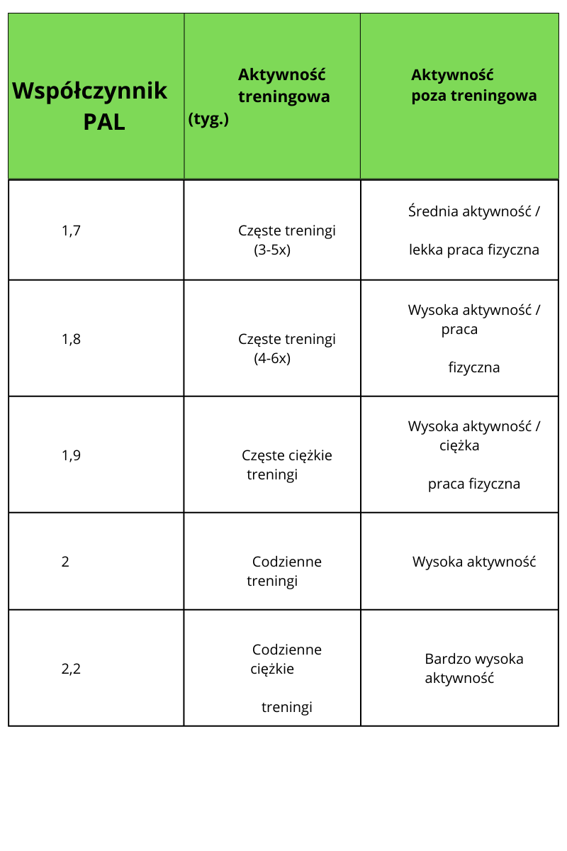 Gdy już mamy obliczone nasze PPM możemy przystąpić do następnego kroku czyli do wyliczenia naszego CPM – całkowitej przemiany materii. Parametr ten pokazuje nam nasze całkowite zapotrzebowanie kaloryczne na dzień tzw. nasze zero kaloryczne czyli wartość kalorii, która umożliwi nam utrzymanie obecnej masy ciała. CPM zależne jest od naszego PPM oraz naszej aktywności w ciągu dnia ( współczynnik PAL).